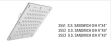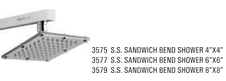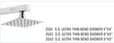 Shower S.S Collection Our Products Curve(O/H Shower) 3546 – ₹ 400 (4”×4”)3547 – ₹ 650 (6”×6”)3548 – ₹ 900 (8”×8”) Curve(Bend Shower) 3566 – ₹ 600 (4”×4”)3567 – ₹ 910 (6”×6”)3568 – ₹ 1190 (8”×8”) Maze(Bend Shower) 3570 – ₹ 525 (4”×4”)3571 – ₹ 775 (6”×6”)3572 – ₹ 1000 (8”×8”) Maze(O/H Shower) 3540 – ₹ 325 (4”×4”)3541 – ₹ 515 (6”×6”)3542 – ₹ 705 (8”×8”) Sandwich(O/H Shower) 3551 – ₹ 370 (4”×4”)3552 – ₹ 540 (6”×6”) 3553 – ₹ 710 (8”×8”) Sandwich(Bend Shower) 3575 – ₹ 600 (4”×4”)3577 – ₹ 820 (6”×6”)3579 – ₹ 1045 (8”×8”) S.S. Ultra Thin(O/H Shower) 3561 – ₹ 275 (4”×4”)3562 – ₹ 425 (6”×6”)3563 – ₹ 575 (8”×8”) S.S. Ultra Thin(Bend Shower) 3581 – ₹ 475 (4”×4”)3582 – ₹ 685 (6”×6”)3583 – ₹ 870 (8”×8”)